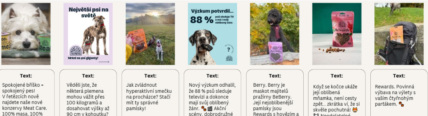 Naši copywriteři k obsahu navrženému v obsahové strategii doplní tone of voice a připraví texty tak, aby přirozeně doplňovaly a rozvíjely vizuální sdělení a prodloužily tak čas strávený u vašich příspěvků.